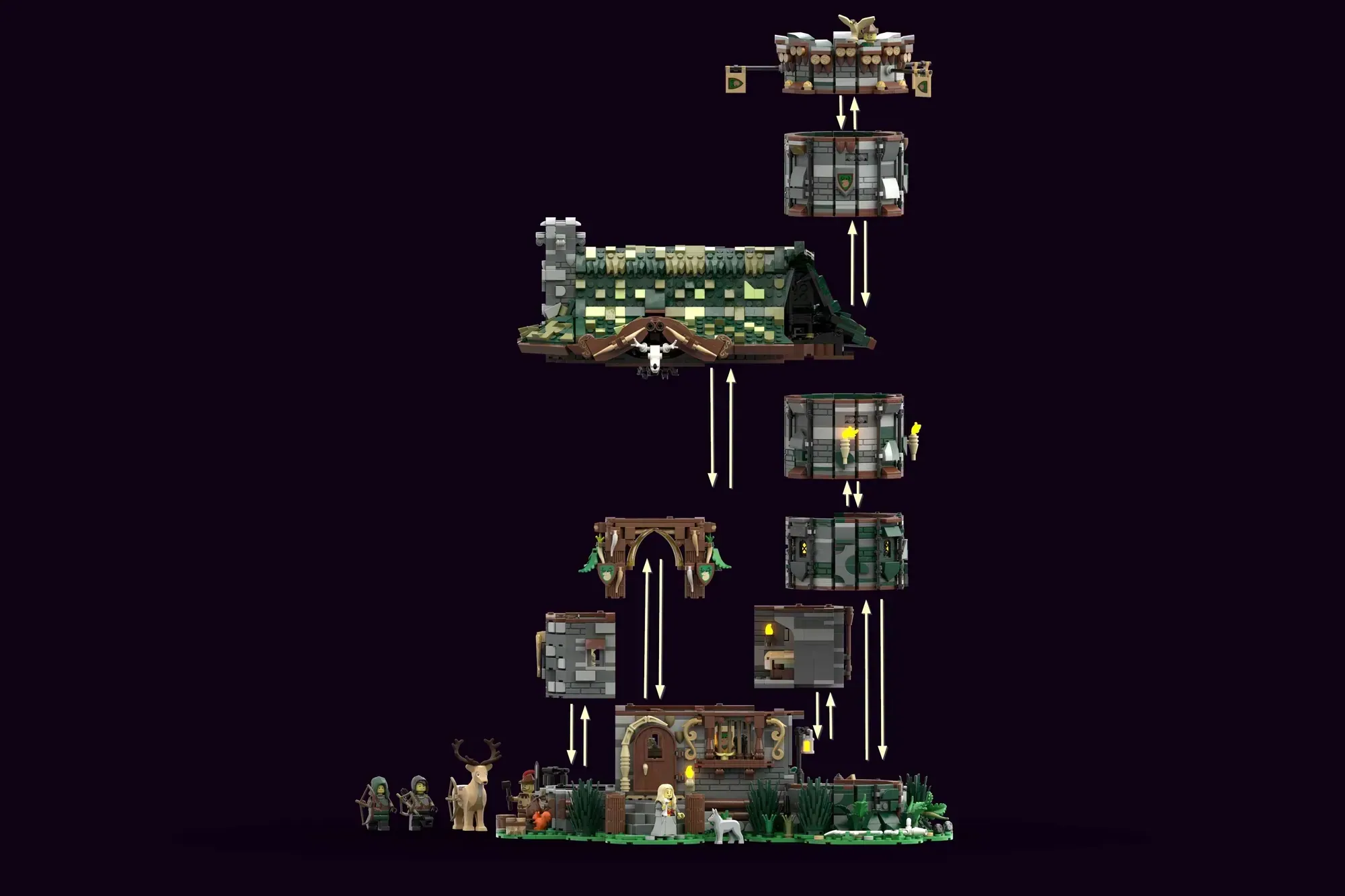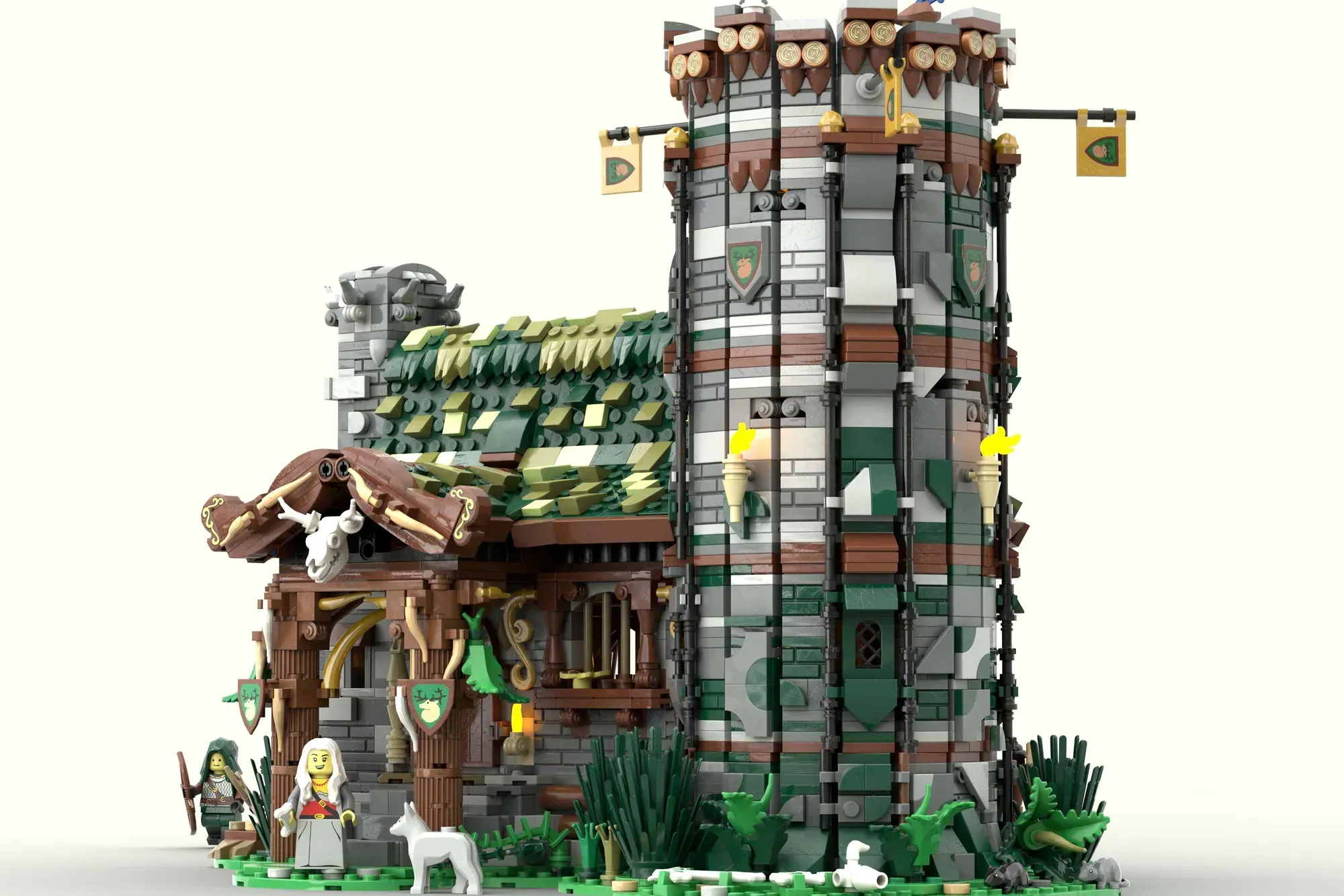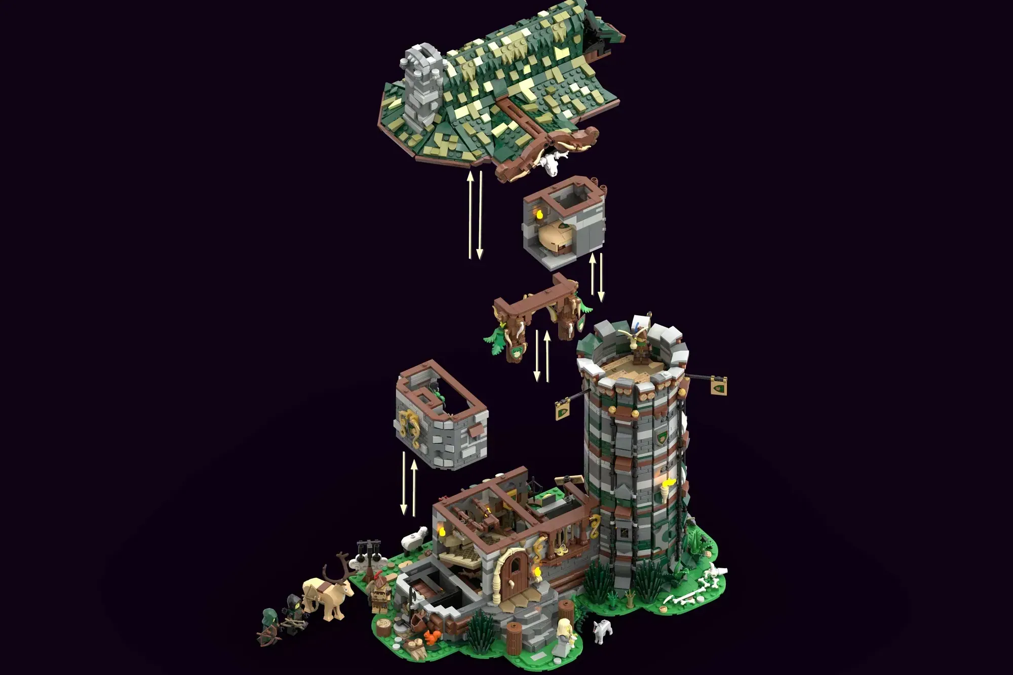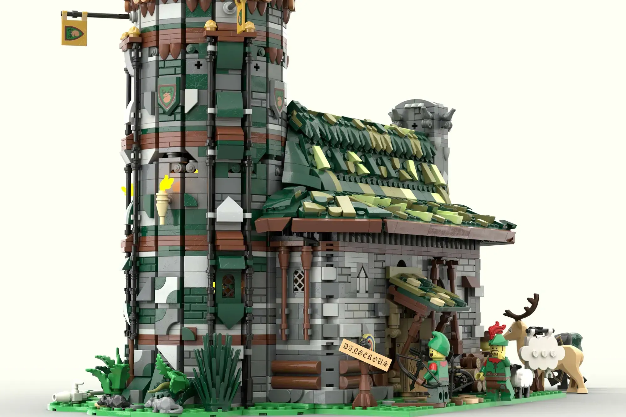 What makes this modular building so special? The Hunter's Hut captures the gritty reality of medieval life through brilliant architectural storytelling. Each floor lifts away independently, revealing detailed interior spaces that show how hunters lived, worked, and defended their communities. From the treasury and armory tucked inside the tower to the practical sheepskin racks for those bone-chilling medieval winters, every brick serves a purpose.