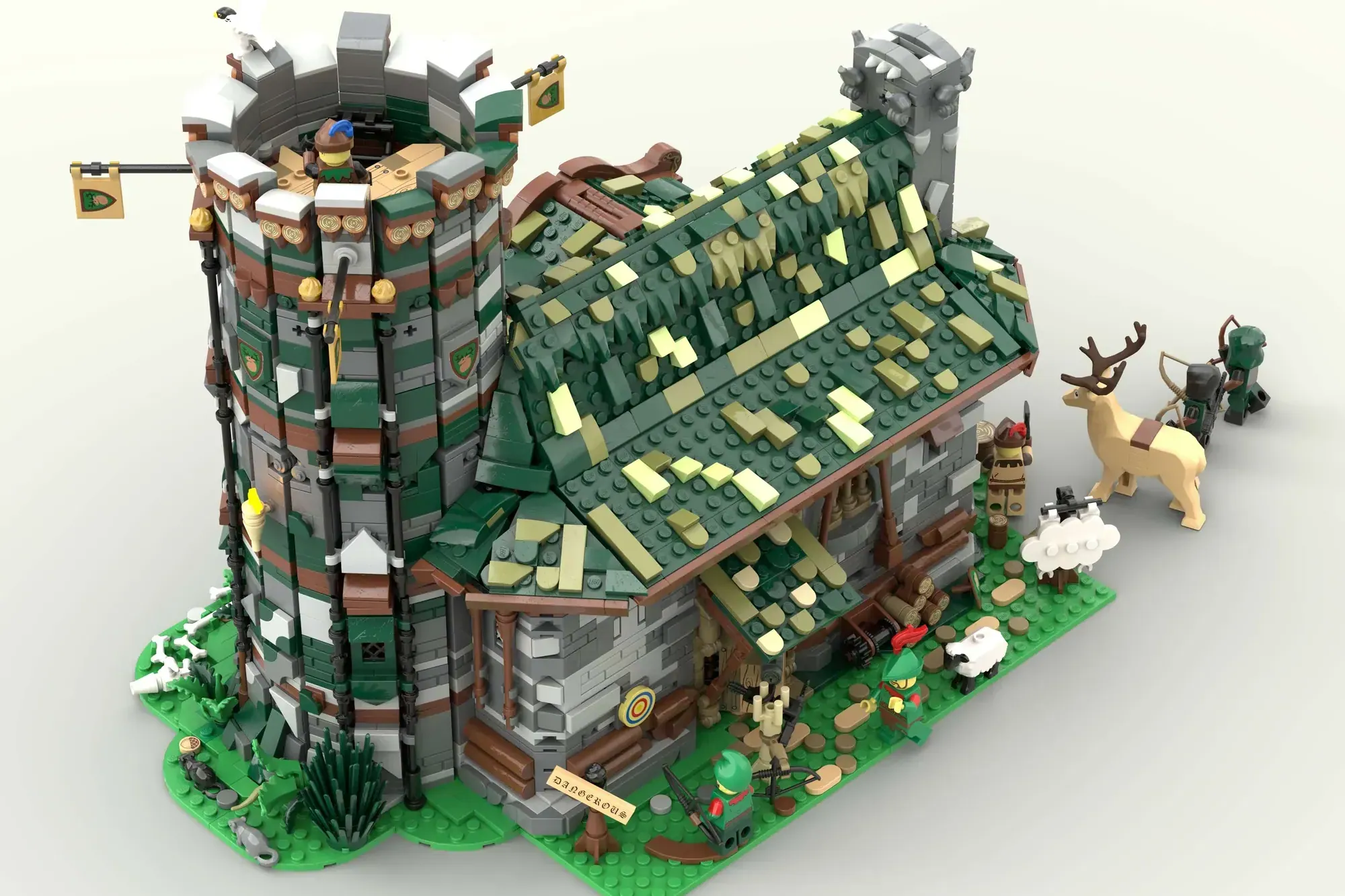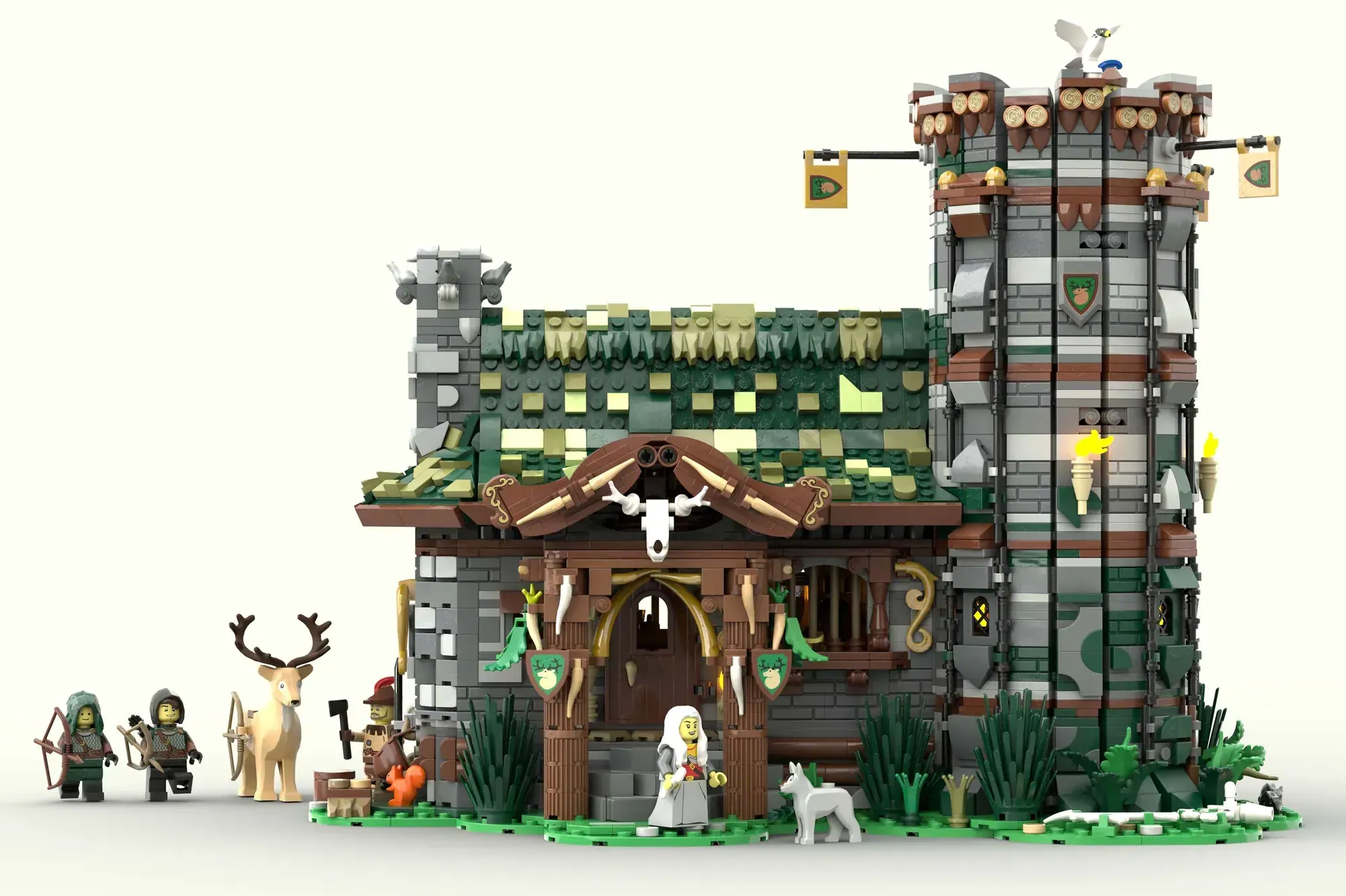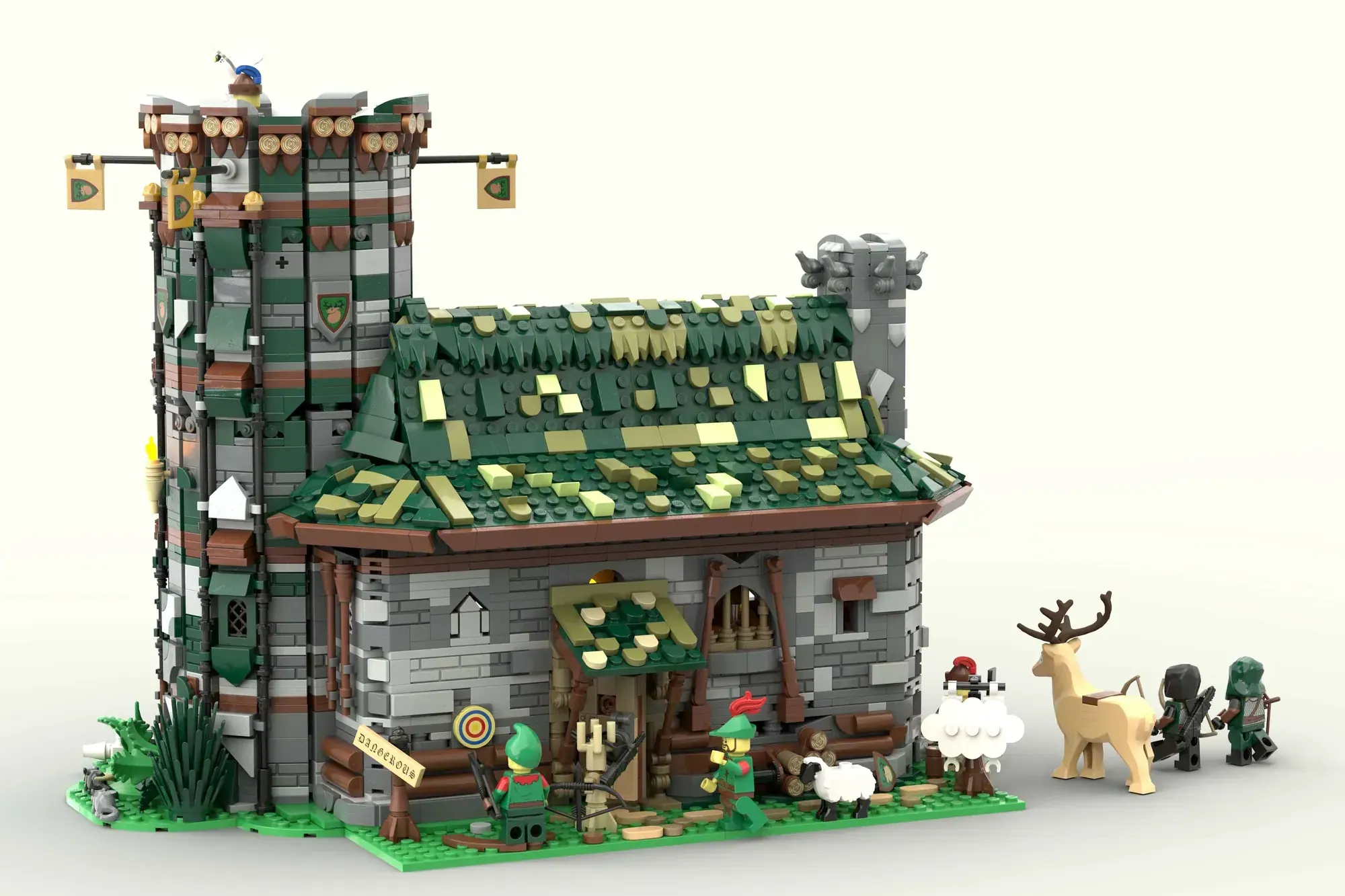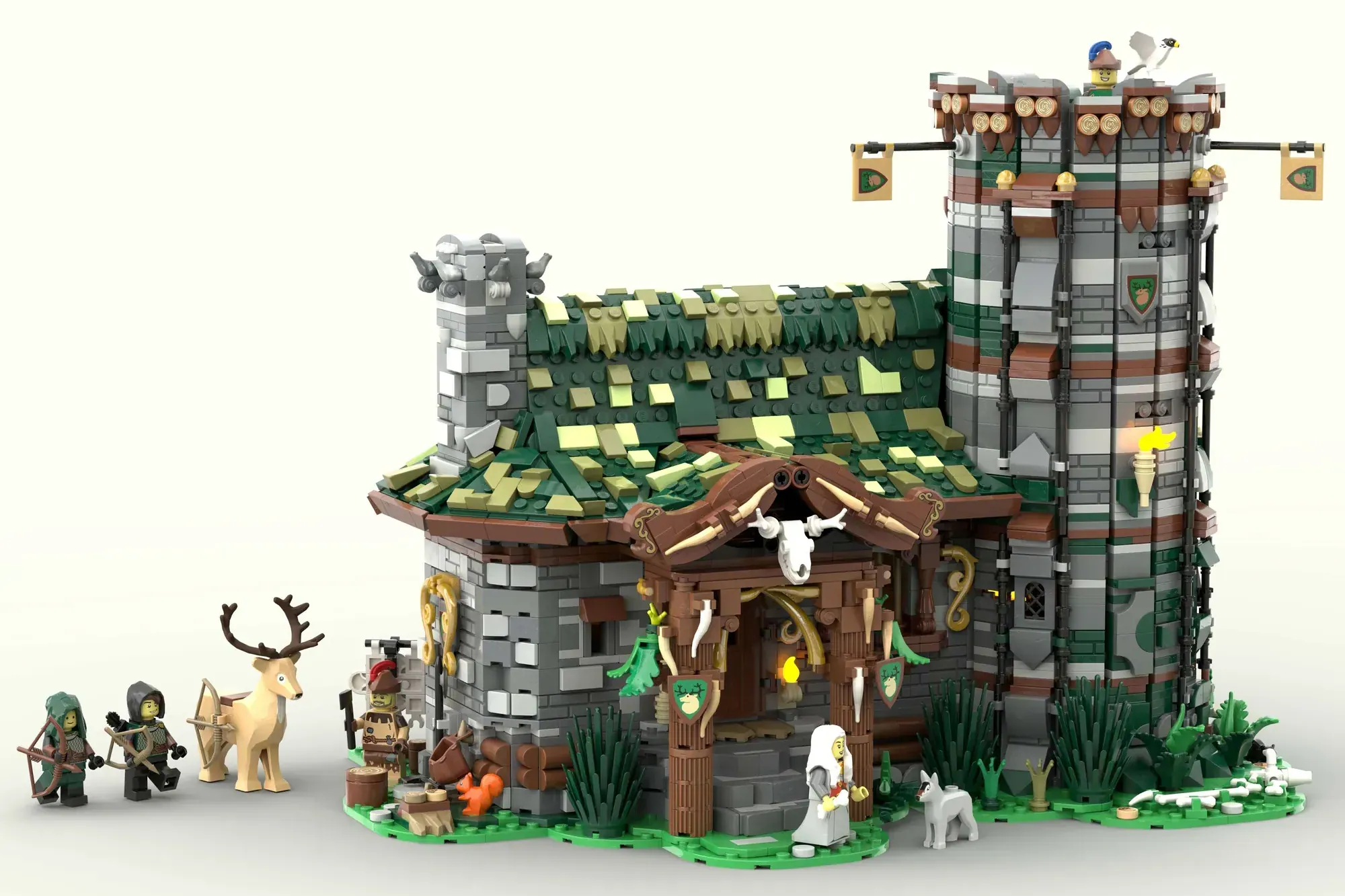 The set doesn't stop at impressive architecture. Behind the hut, future archers can perfect their skills at a dedicated archery training ground. Wildlife enthusiasts will love the included deer, sheep, and falcon, plus a loyal canine companion. Eight detailed minifigures in period-appropriate outfits bring the whole scene to life, making you wonder what stories these walls have witnessed.