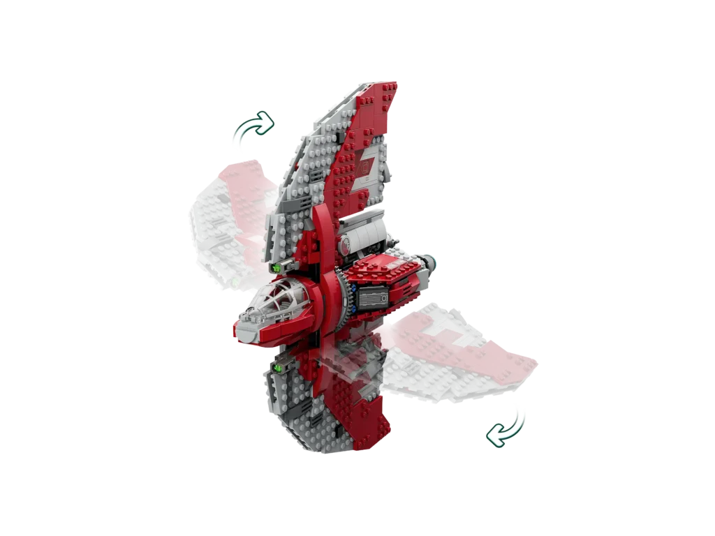 This ship model has a feature that causes the wings to rotate around the cabin during flight, something that made me very curious to see how LEGO would do this. And LEGO managed to reproduce this feature very well, using a Technic turntable, which allows the wings to move very smoothly.
