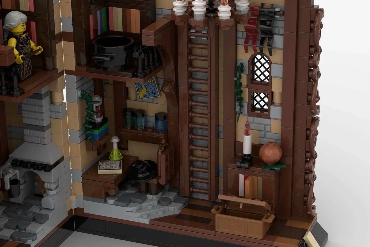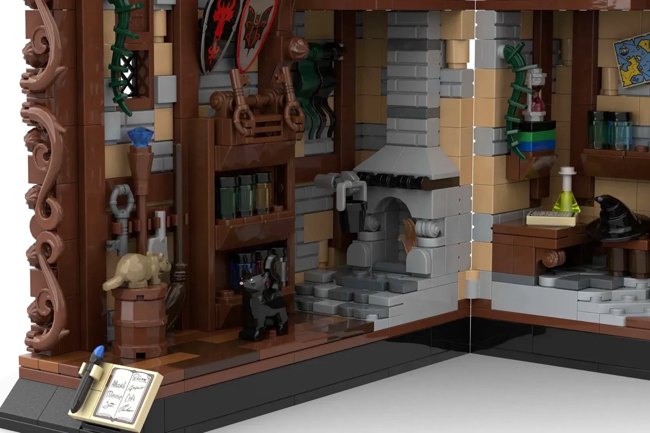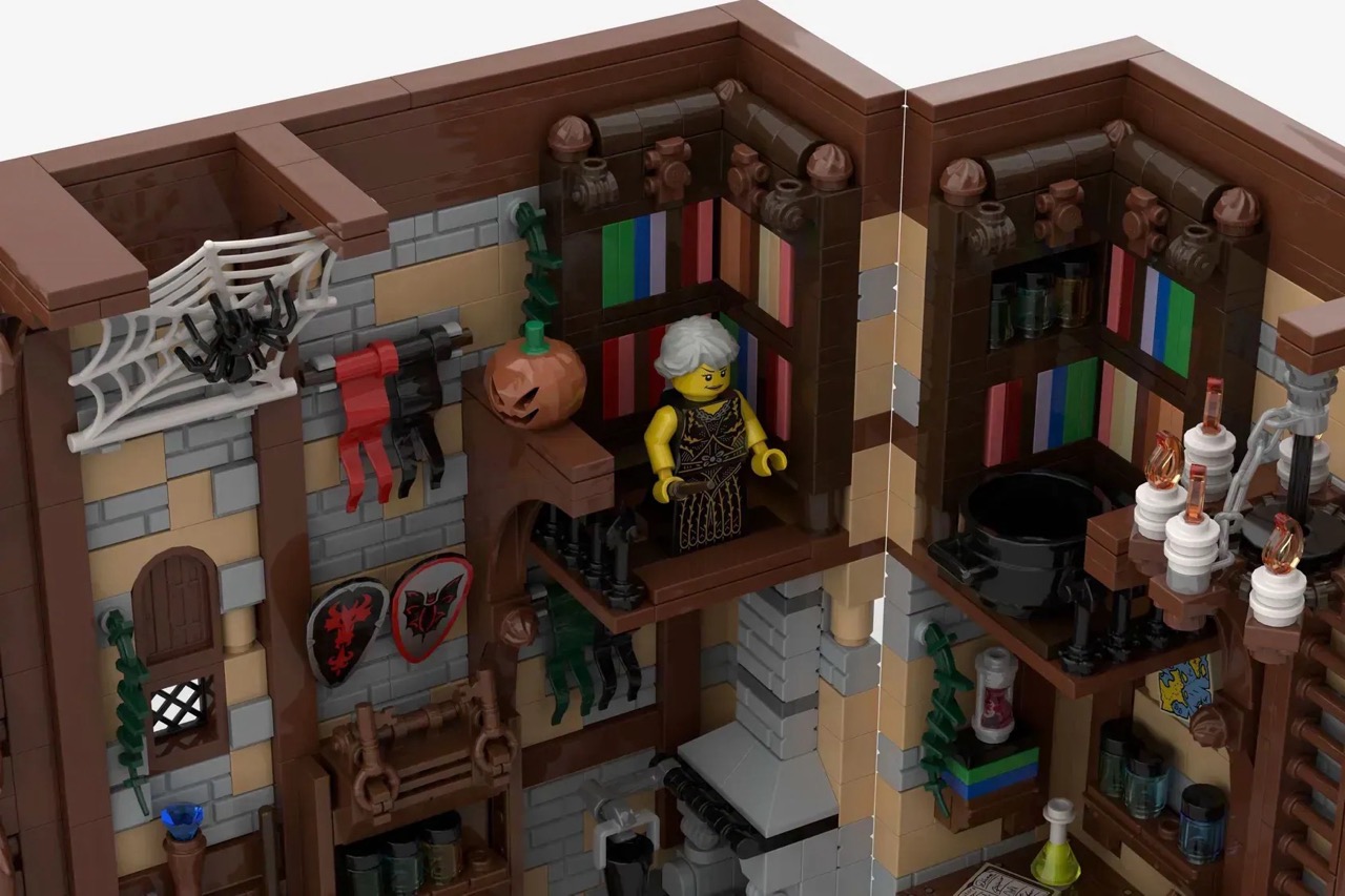 The design by Owen87 is compact: about 10 by 20 by 25 centimeters. Small footprint, large imagination. The set uses 1261 pieces, each carefully arranged to recreate the witch’s secret lair. There’s a roaring fireplace, a potion table bubbling with mystery, dusty bookshelves, and, because superstition demands it, a black cat keeping watch.
