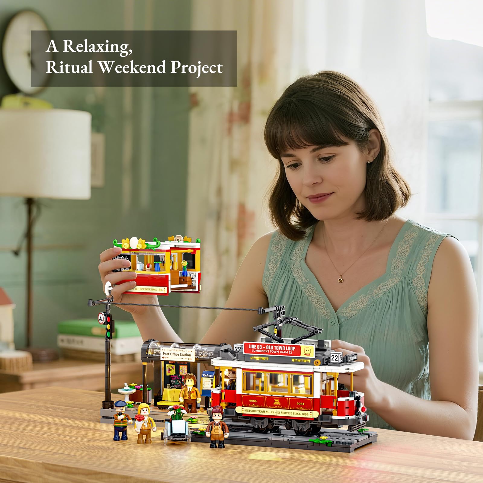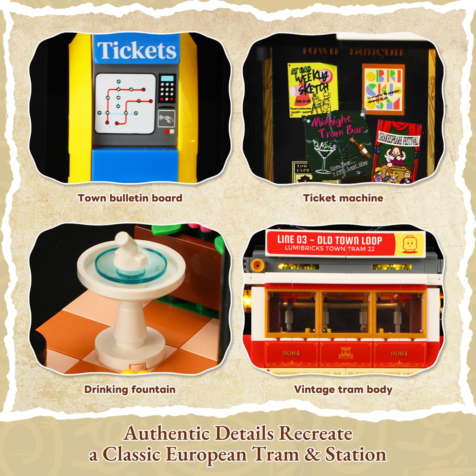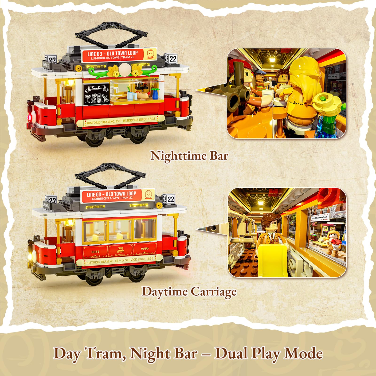 Lumibricks Heritage Tram and Station Building Set with Light,1274Pcs, Vintage Decor, with 2 Scenes: Tram and Bar Car, compatible with Modular Buildings - Gift Idea for Adults,L9084