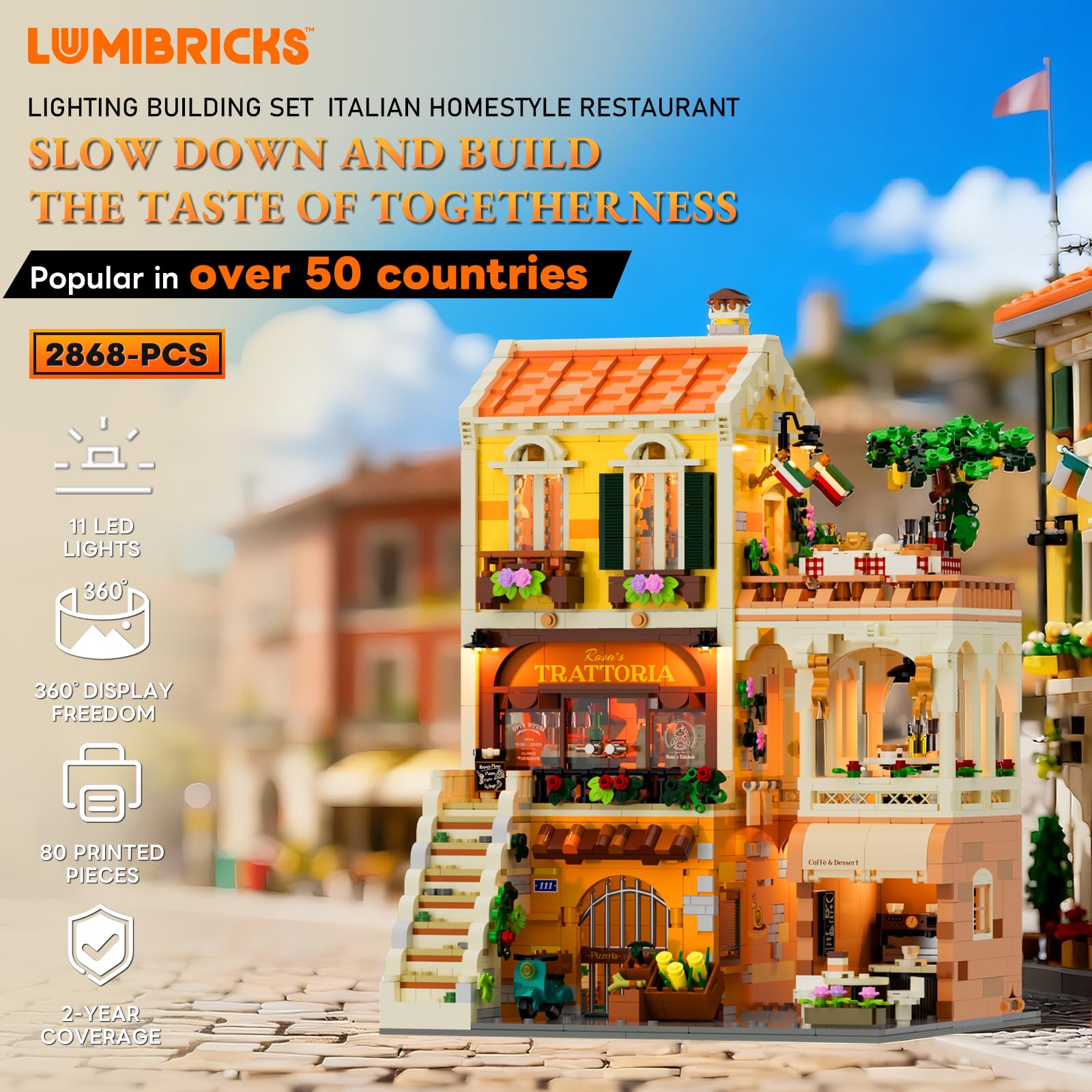 Lumibricks Italian Homestyle Restaurant Building Set with Light, 2868pcs Modular Building with Pizzeria & Cafe, Mediterranean Home Décor, for Food Lovers & Brick Fans